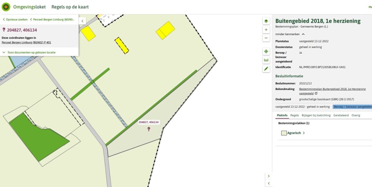 Het perceel is gelegen in het bestemmingsplan “Buitengebied 2018, 1e herziening - Gemeente Bergen (L.)” en heeft bestemming Agrarisch