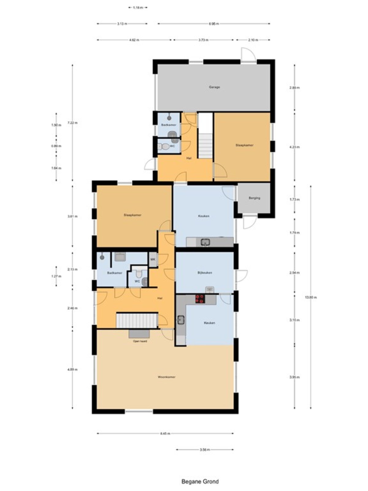 hal, trapopgang, meterkast, toilet, woonkamer met open keuken, bijkeuken, kelder, twee slaapkamers, badkamer met vaste wastafel en douche, berging, hal, toilet, douche, trapopgang, kelder, garage.