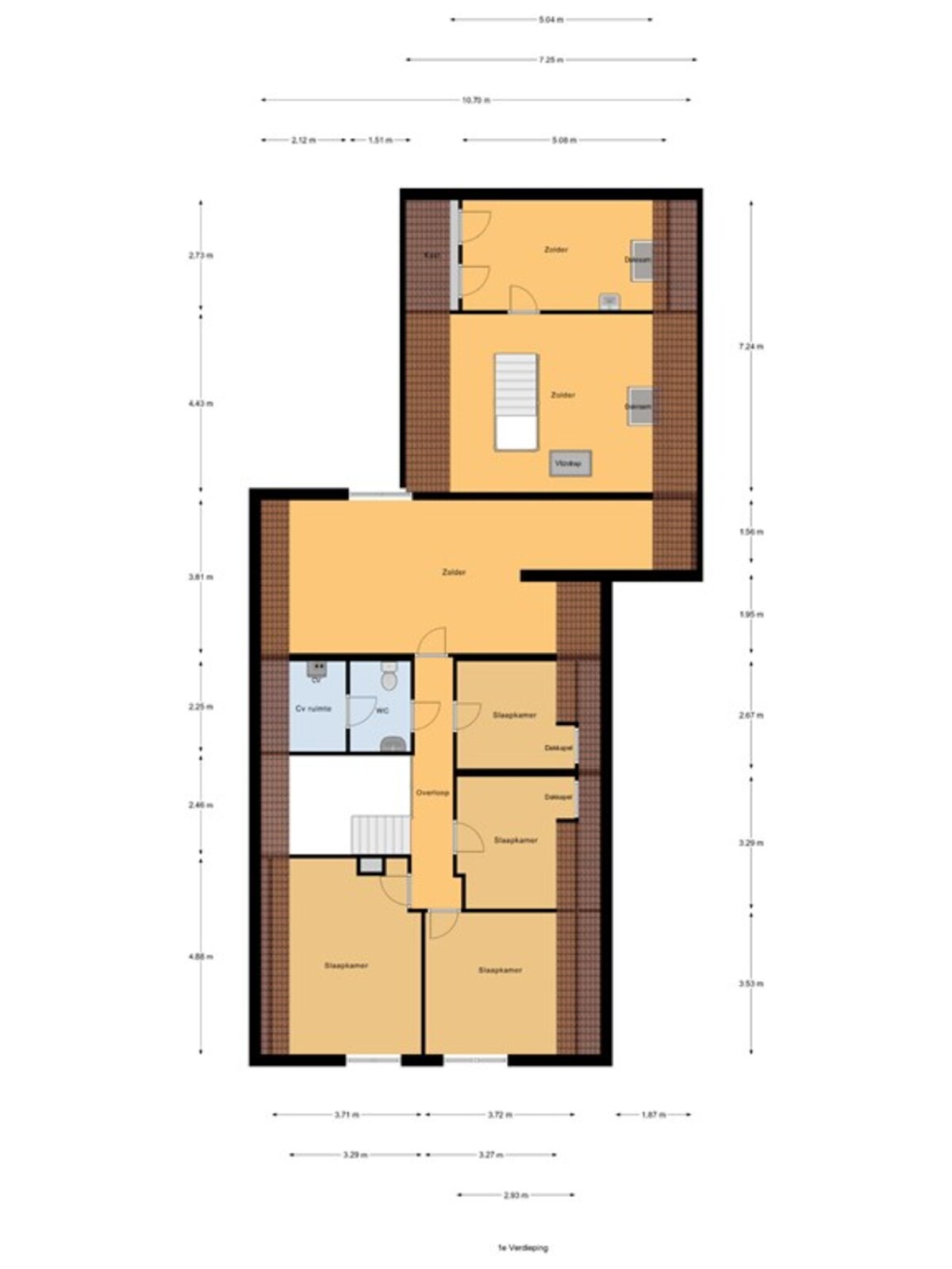 -overloop met vier slaapkamers, toilet met vaste wastafel en mogelijkheid tot douche, cv ruimte en zolderruimte.