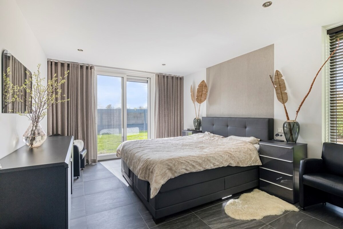 Vanuit de woonkamer heeft u toegang tot de grote slaapkamer ensuite met een totale oppervlakte van 36 m². De slaapkamer, met aangrenzende badkamer op de begane grond, geeft een gevoel van luxe en comfort. De slaapkamer beschikt over een inloopkast en de schuifpui geeft direct toegang tot de tuin. De badkamer is voorzien van een dubbele wastafel, toilet, ruime inloopdouche, een sunshower en ventilatie.