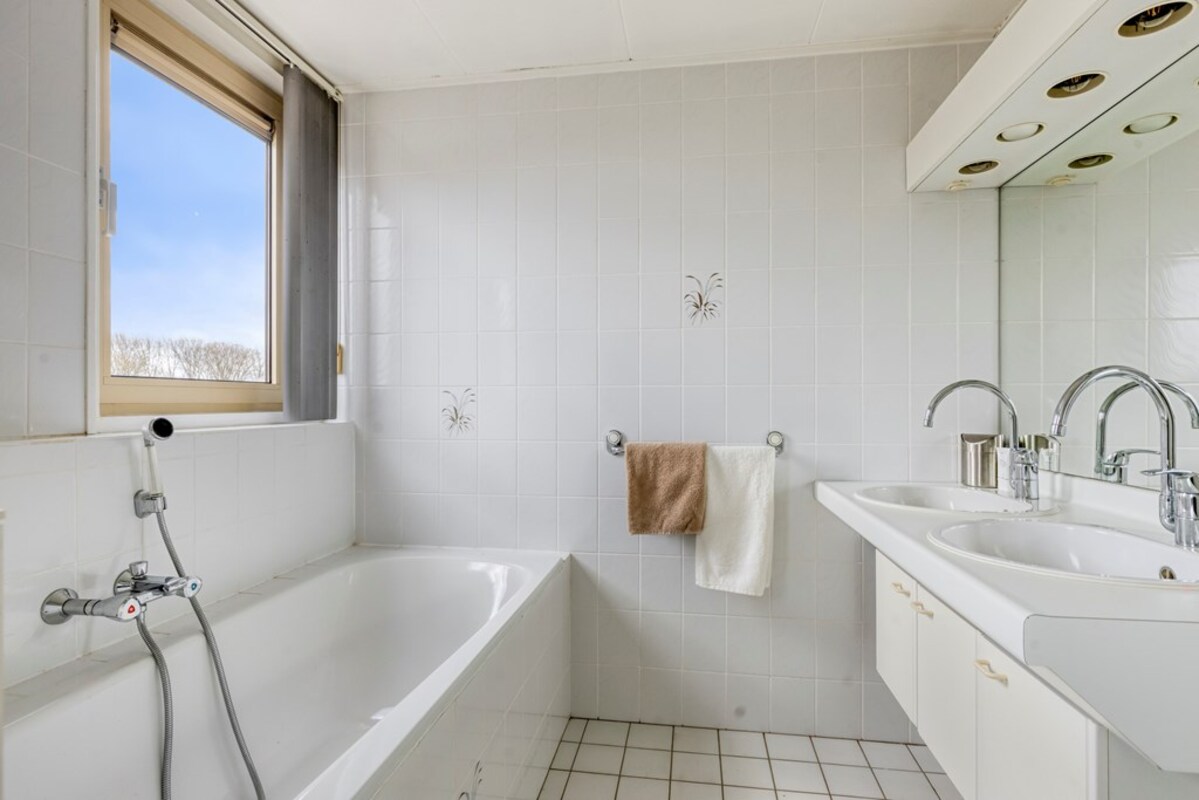 Op de eerste verdieping bevinden zich drie comfortabele slaapkamers en een complete badkamer. De grote slaapkamer heeft een oppervlakte van 26 m². De slaapkamers zijn praktisch ingericht en voorzien van knieschotten, waardoor er volop extra bergruimte beschikbaar is. De badkamer is volledig uitgerust met een dubbele wastafel, ligbad, douchecabine en toilet.