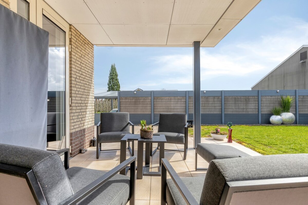 Het geheel is omsloten door een composiet-stalen schutting met verlichting, in combinatie met een groene haag, wat zorgt voor privacy en een verzorgde uitstraling. De verlichte carport biedt plaats aan twee auto’s en zorgt voor comfortabel overdekt parkeren, voorzien van laadpunt voor uw elektrische auto.