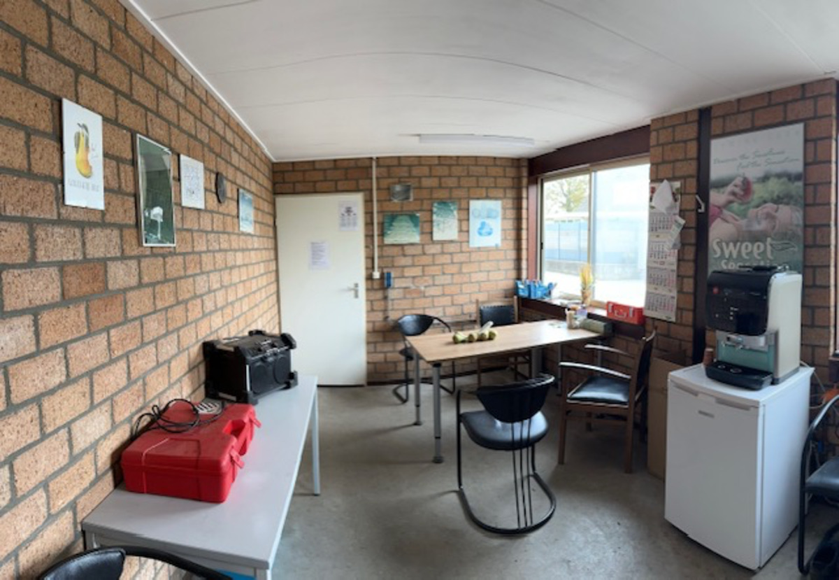 - Voorzijde welke is ingericht met kantine, toilet, opslagruimte voor gewasbeschermingsmiddelen, werkplaats en meterkast. Daarboven een kantoorruimte.