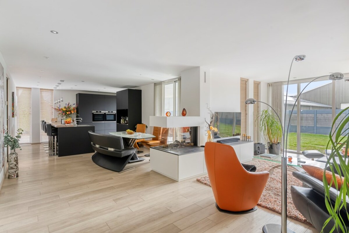 De woning is met oog voor detail en luxe afgewerkt, waarbij hoogwaardige materialen en verfijnde keuzes centraal staan. Ingebouwde verlichting, strakke stucplafonds en een stijlvolle tunnel(gas)haard creëren een warme en eigentijdse ambiance. De zorgvuldig op elkaar afgestemde kleuren van wanden en vloeren zorgen voor een harmonieus geheel, terwijl de vele hoge raampartijen een overvloed aan natuurlijk licht binnenlaten en de ruimtes een prachtige, open uitstraling geven.