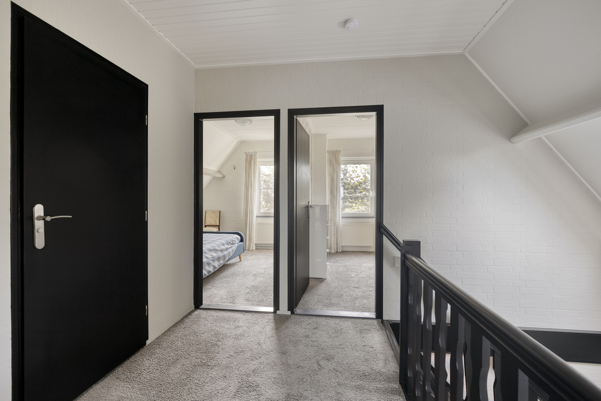 Overloop met toegang tot drie slaapkamers en een moderne badkamer (2021) met wastafel, toilet en douche.