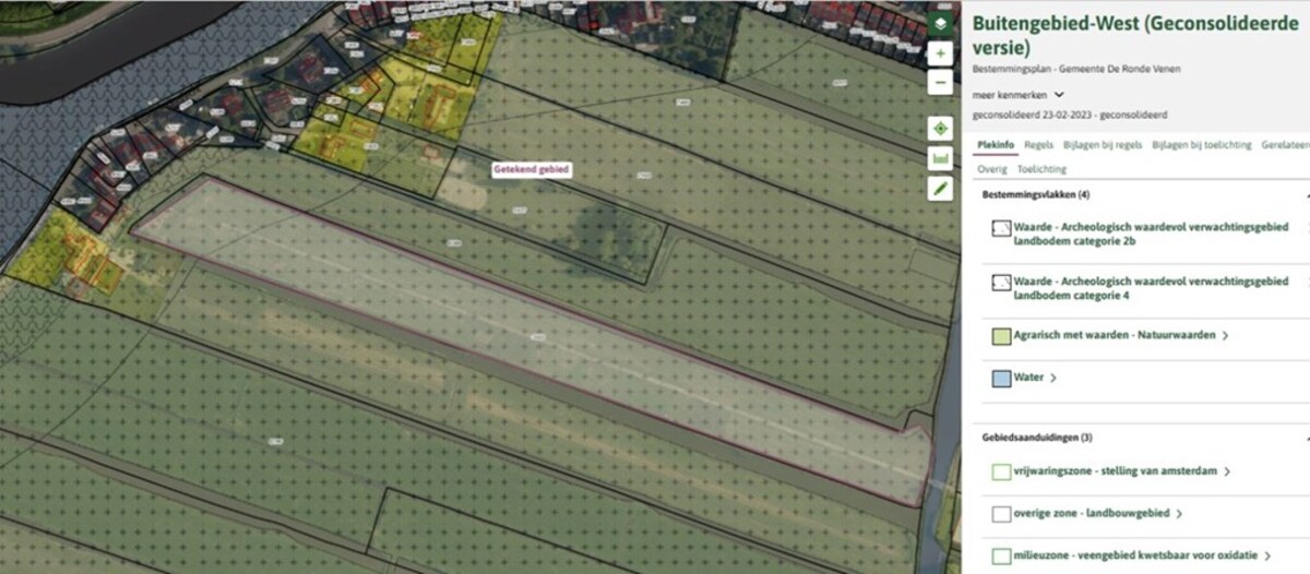 Het vigerende bestemmingsplan is het Bestemmingsplan ‘Buitengebied-West van de gemeente De Ronde Venen van 23 februari 2023 met de volgende bestemmingsvlakken: ‘Agrarisch met waarden – Natuurwaarden, Water, Waarde- Archeologisch waardevol verwachtingsgebied landbodem categorie 2b en 4, de gebiedsaanduiding is overige zone – landbouwgebied, vrijwaringszone – stelling van Amsterdam, milieuzone – veengebied kwetsbaar voor oxidatie.