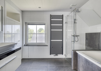 Via de trap in de gang bereikt u de eerste verdieping, waar zich twee ruime slaapkamers en één kleiner slaapkamer bevindt. Daarnaast is er een luxe badkamer aanwezig, uitgerust met een whirlpool, een in natuursteen uitgevoerde dubbele wastafel, een inloopdouche en een toilet. De badkamer is voorzien van vloerverwarming.